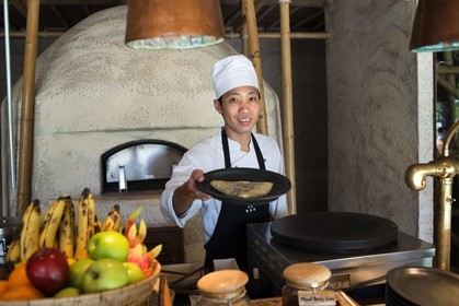 • Six Senses Resort, Koh Yao Noi, Phang Nga Bay, Thailand, Asia. Waiter with a pancake in a breakfast time.