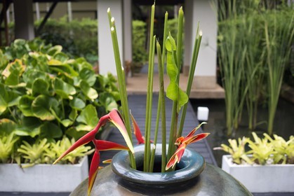 • Vase with flowers in the garden in the spa of Anantara Si Kao Resort & Spa, south of Krabi, Thailand.