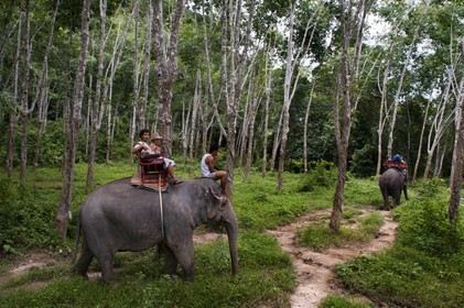• Elephant riding in rubber tree forest. Krabi. Thailand, Asia. Krabi Nature Elephant Trekking & River Camp. The elephant camp is just a 7 km. car ride from Ao Nang where the natural surroundings provide permanent shade and abundant water for the animals all the year around.