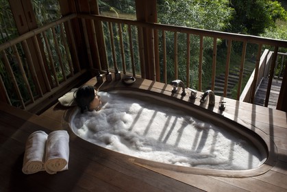 • Six Senses Resort, Koh Yao Noi, Phang Nga Bay, Thailand, Asia. Nice girl in a private foam bath in the bathtub for private treatments. The terrace area has sun loungers and an outside dining area.