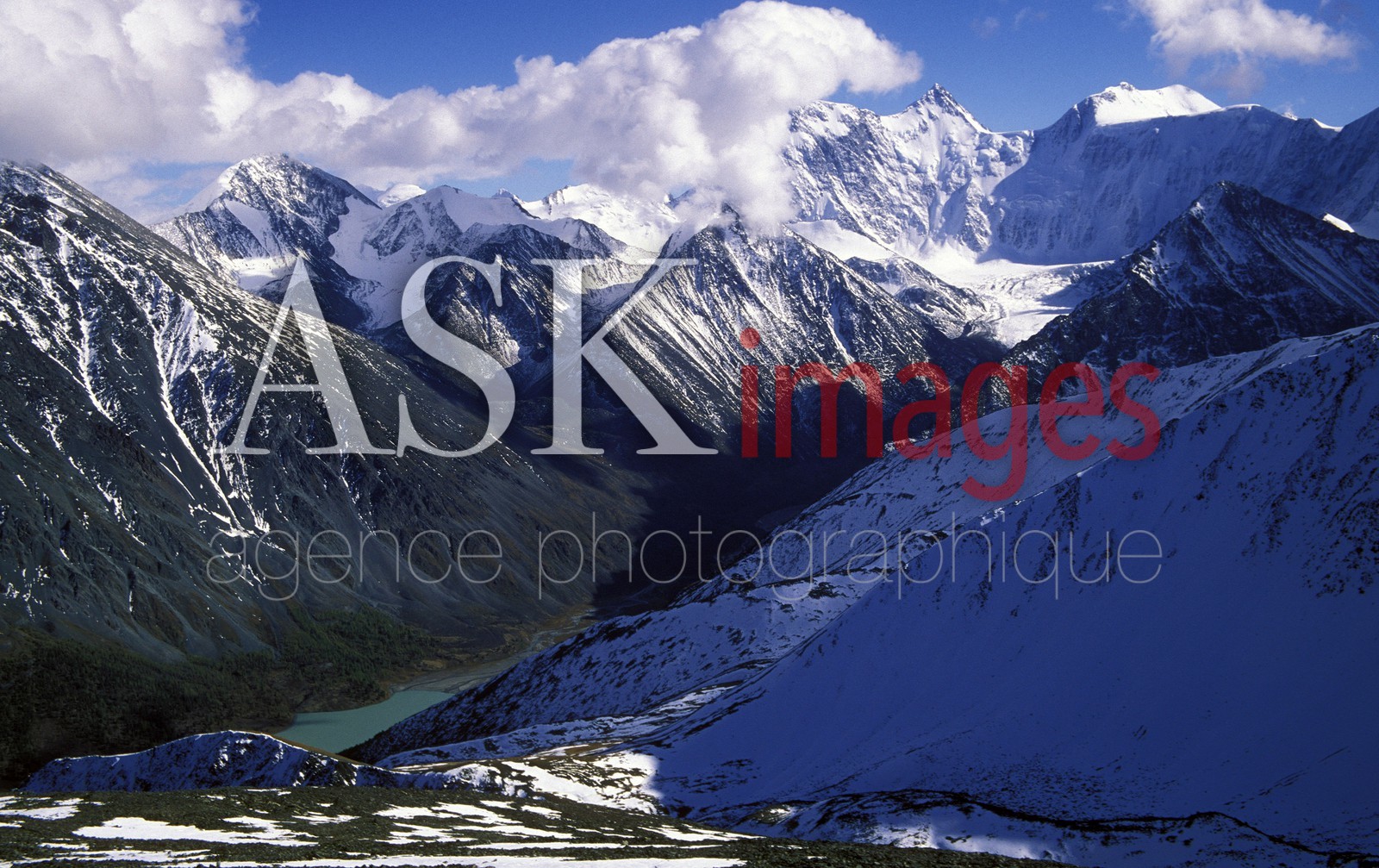 | Description | Altai Mountains, Katunskiy Ridge with panorama of massive Mt Belukha (4506m), the highest in Siberia, with many peaks and glaciers, end of September, Russia |